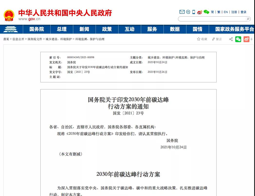 國務(wù)院關(guān)于印發(fā)2030年前碳達(dá)峰行動方案的通知