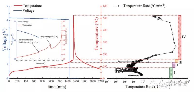 圖1 三元鋰離子電池熱失控過程中溫度、電壓變化