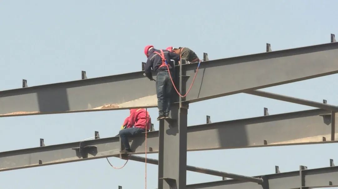 在金昌漢星能源有限公司項目施工現(xiàn)場,記者看到,項目所需建筑材料已陸續(xù)到位,隨著最后一根鋼梁被吊起安裝到樓頂?shù)念A定位置上,該項目的2棟主體鋼結構廠房已全部實現(xiàn)封頂。記者通過樓梯進入其中一棟樓內(nèi)部,看到三層樓頂?shù)木€路和管網(wǎng)安裝已經(jīng)完成,施工人員一邊對腳手架進行固定,一邊對鋼筋綁扎進行檢查。